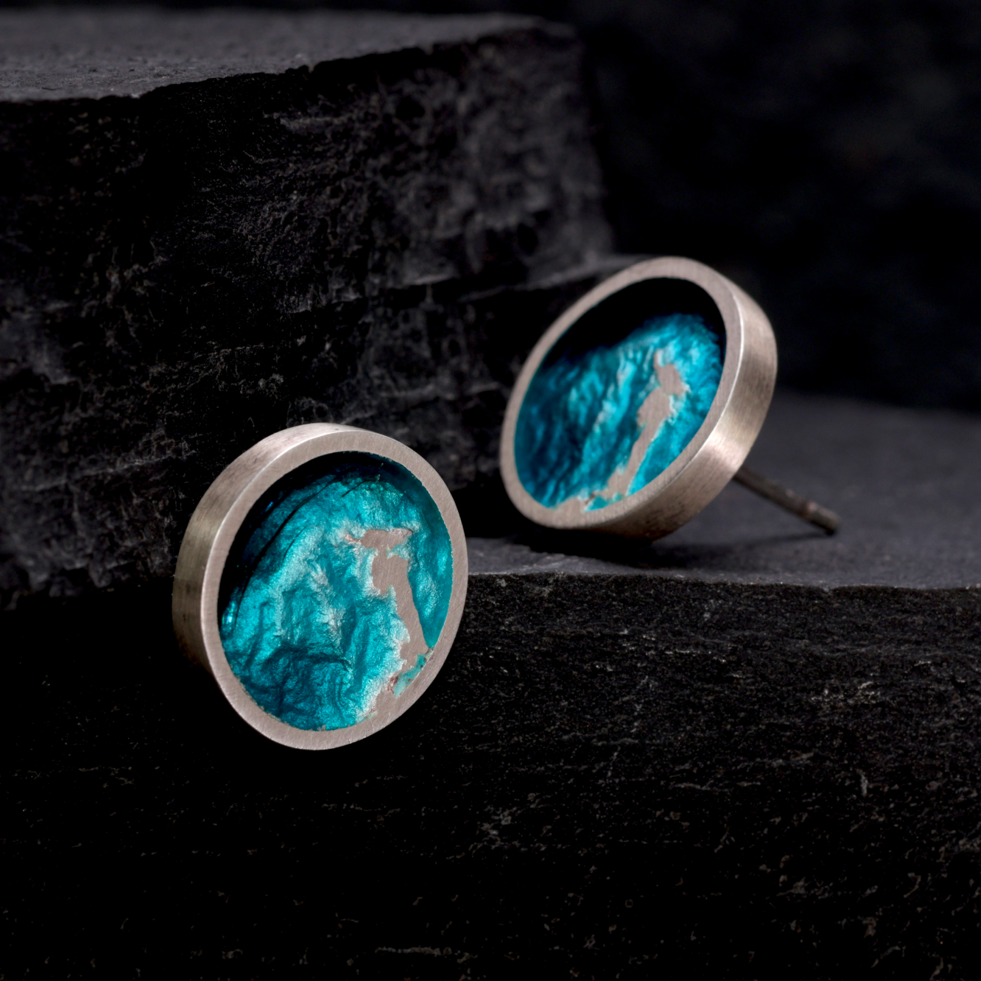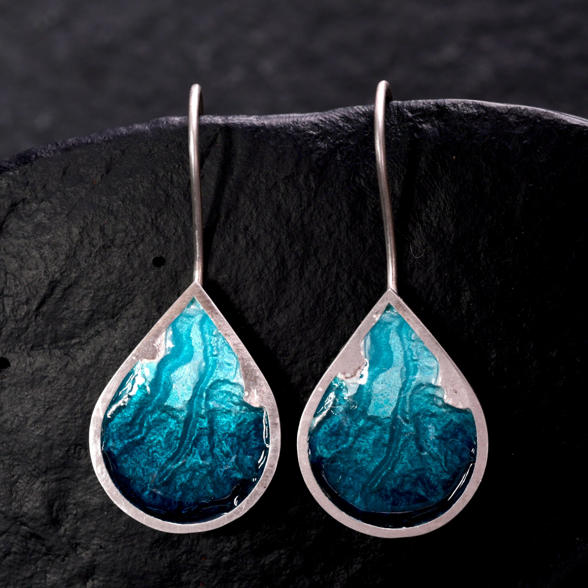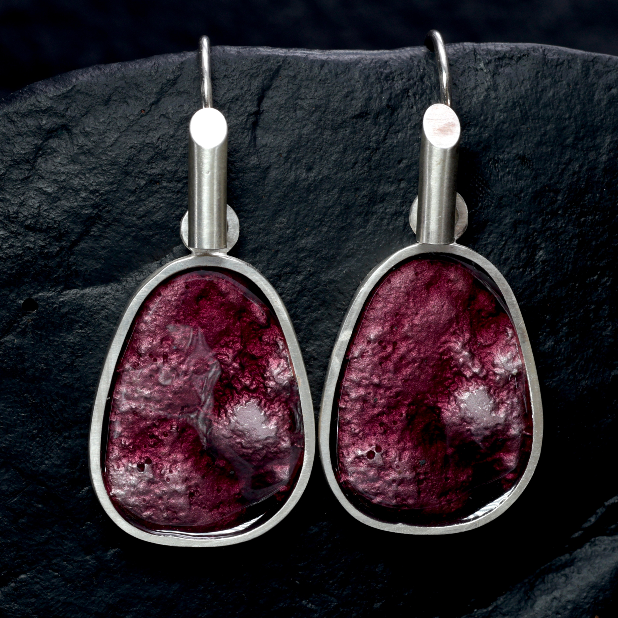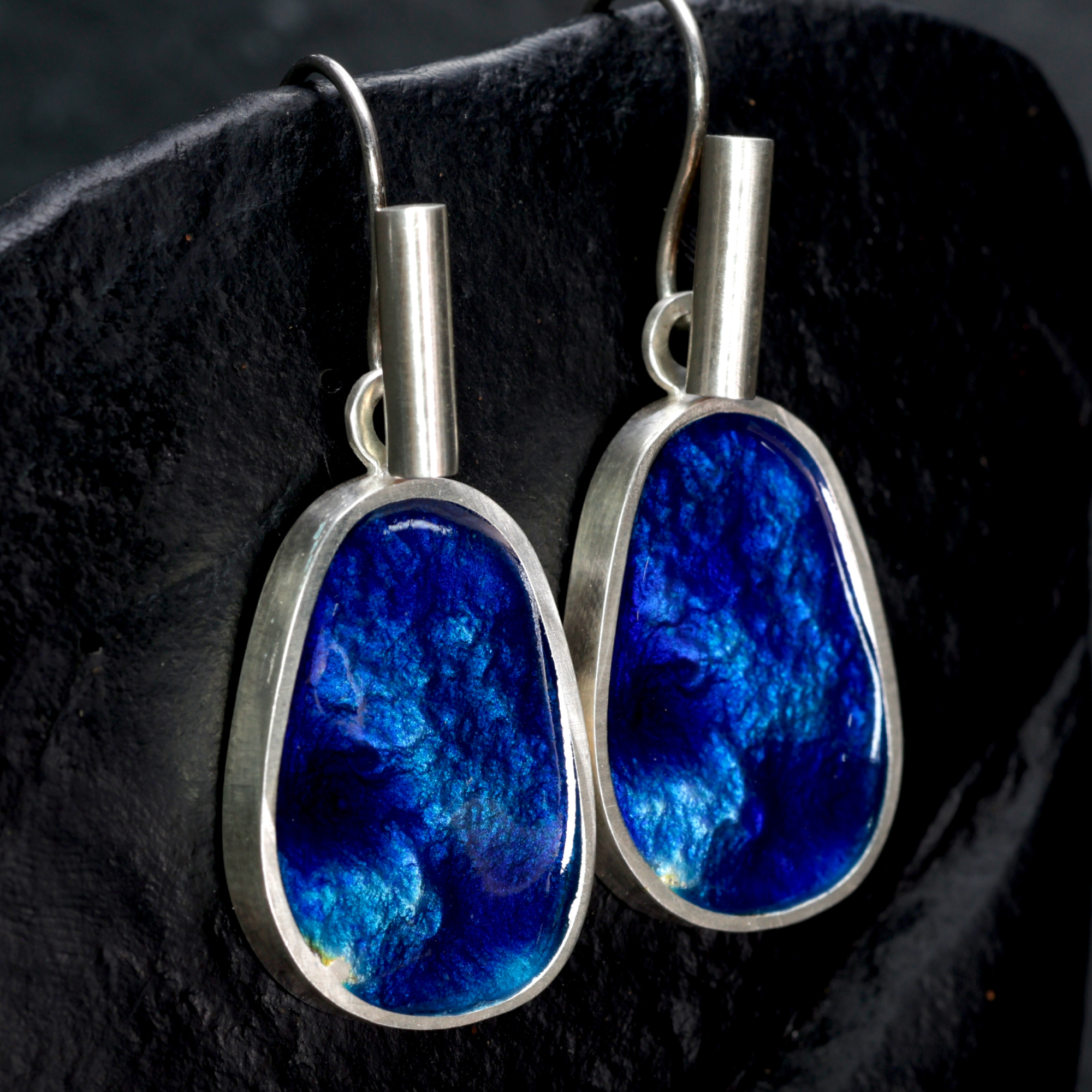 Fine silver drops on sterling silver hooks, enamelled on both sides so they can be worn either way.