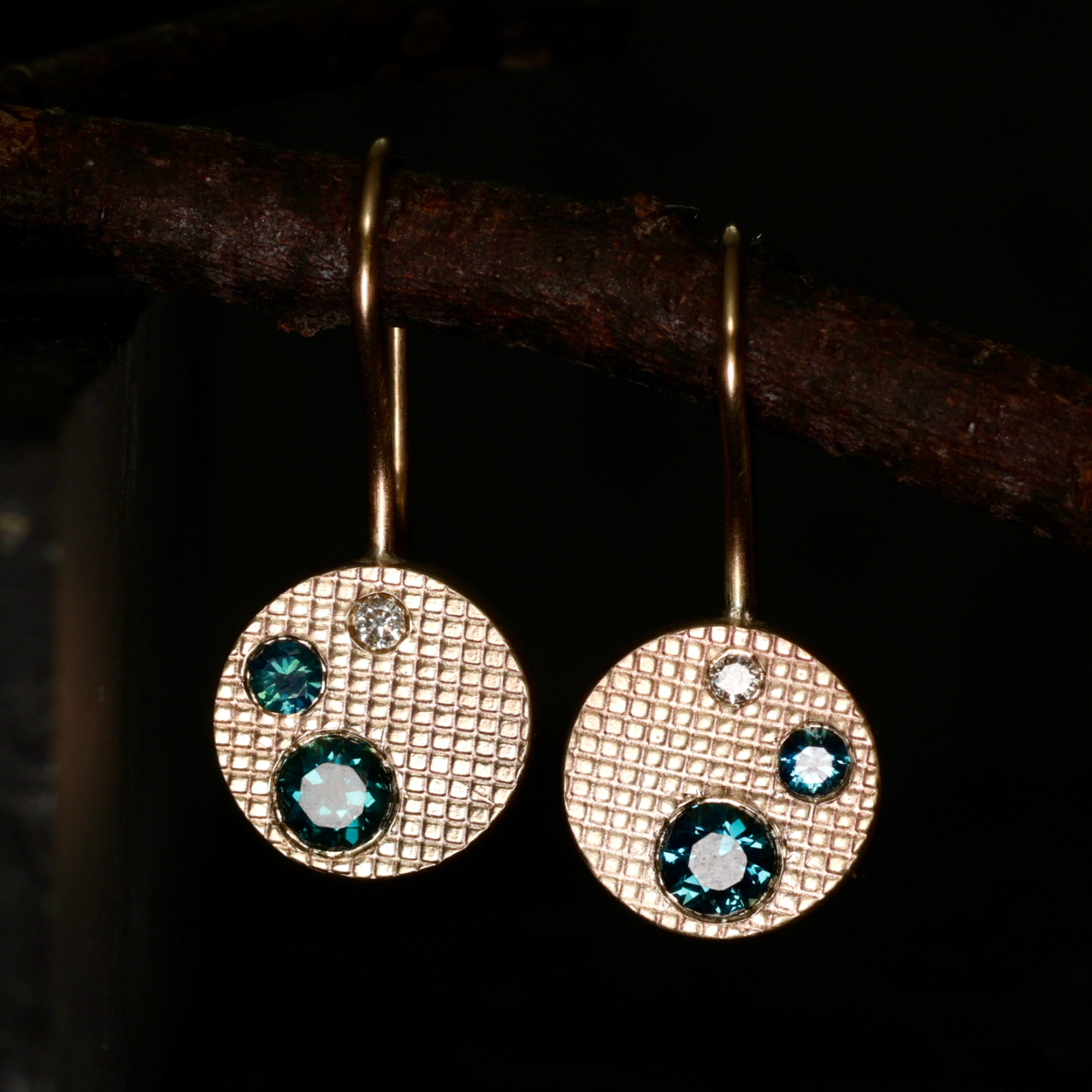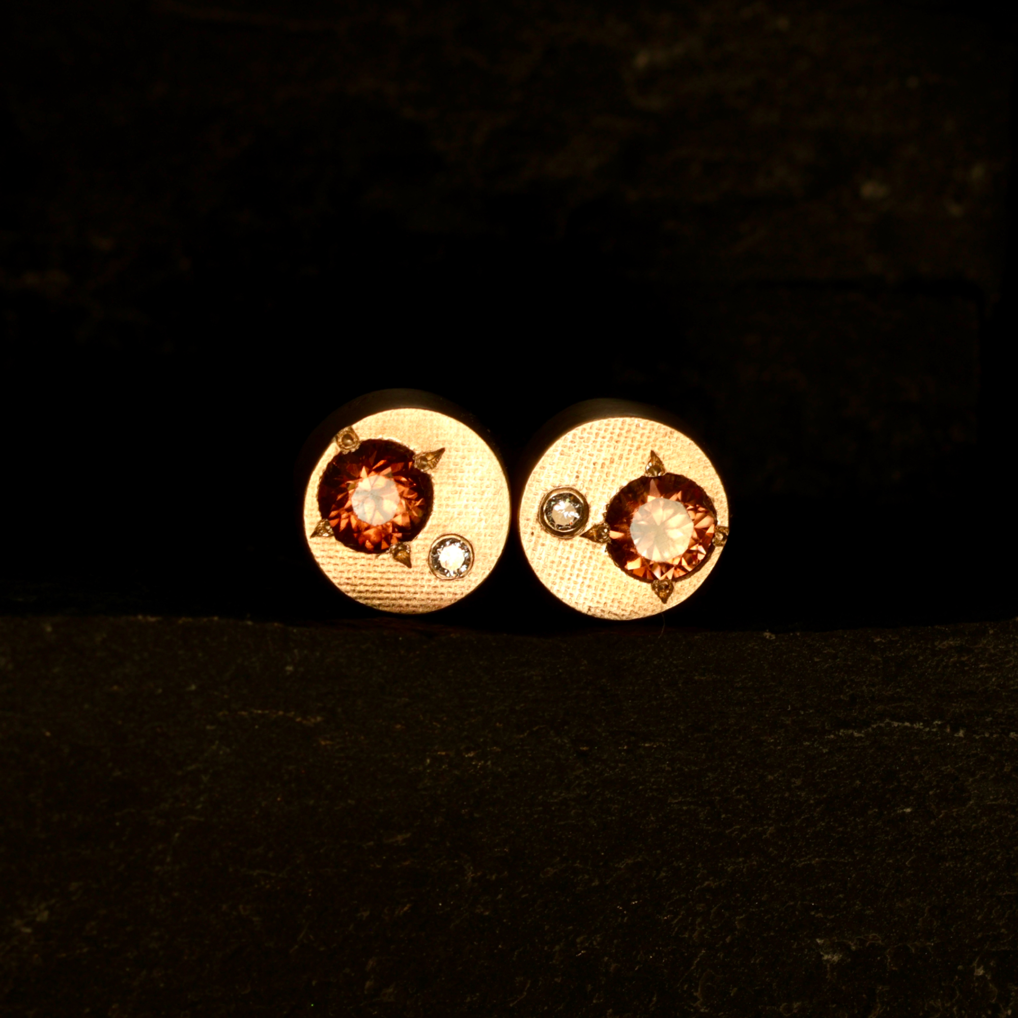 9ct yellow gold studs with a fine cross-hatch texture, set with Australian zircons and small white diamonds. 8mm diameter, 4mm deep, total weight 1.2g.