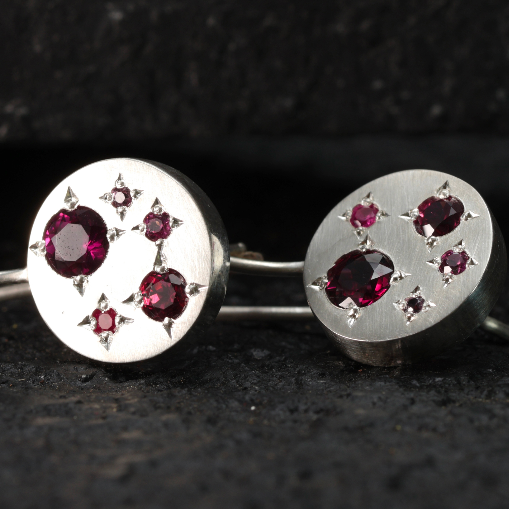 Sterling silver earrings set with rhodolite garnets and pink sapphires. 29mm total drop length, diameter of disc 12mm, total weight each 2.4g.