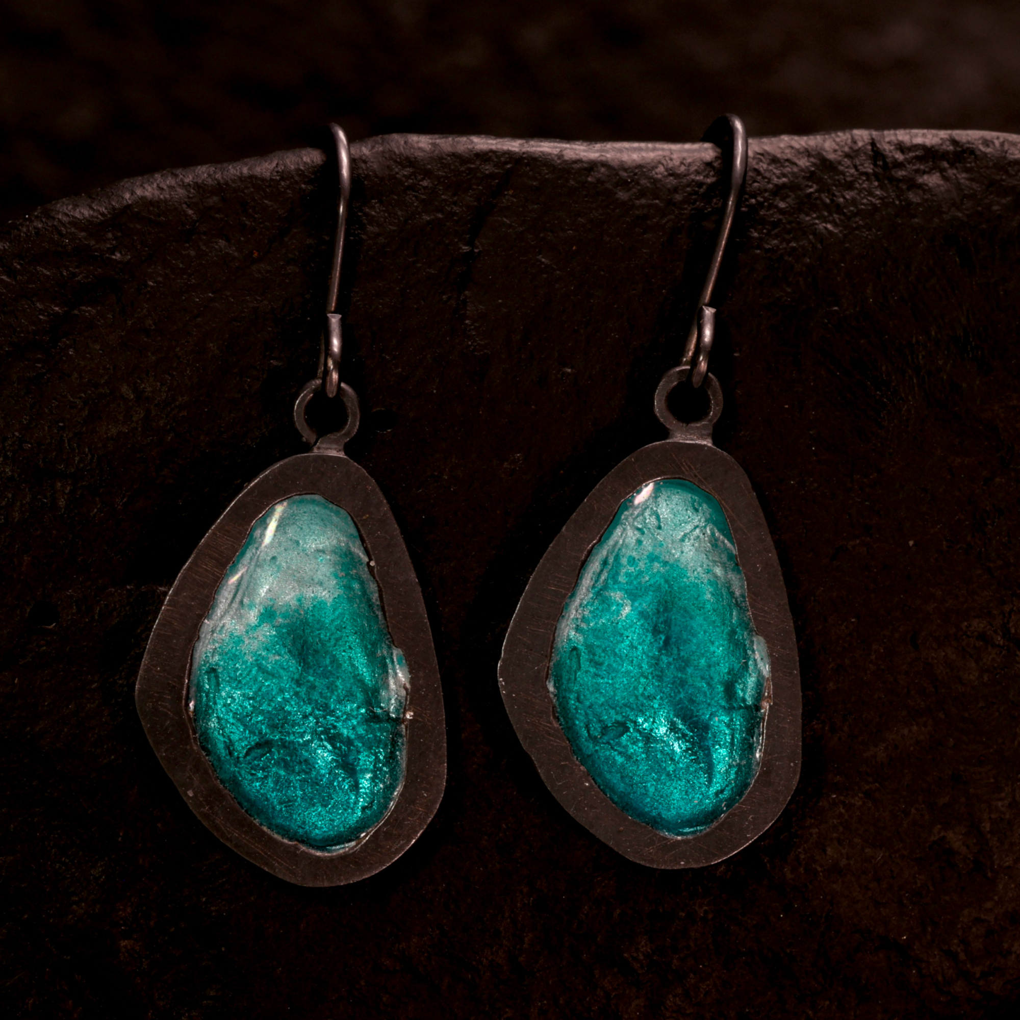 Layers of transparent vitreous enamel are kiln-fired over a textured surface, held within a shape that echoes volcanic crater lakes, allowing light to move through the colour and reveal the texture beneath.