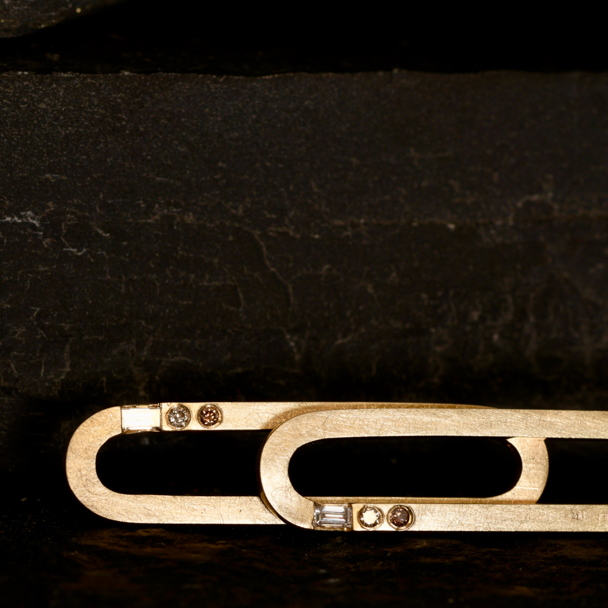 Urban in spirit, softened by hand-applied texture, punctuated with white baguette diamonds and warm champagne and cognac rounds.