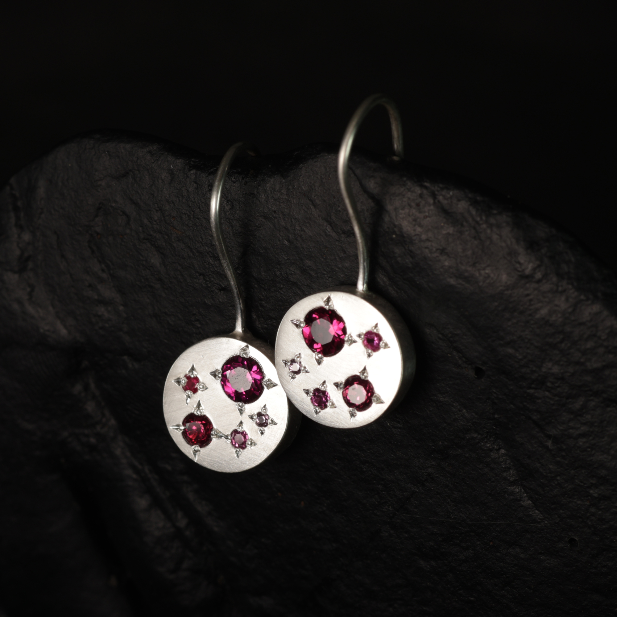 Sterling silver earrings set with rhodolite garnets and pink sapphires. 29mm total drop length, diameter of disc 12mm, total weight each 2.4g.